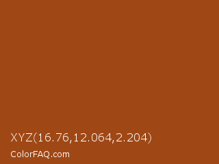 XYZ 16.76,12.064,2.204 Color is a normal orange color and the nearest color is Hawaiian Tan #9d5616. Hex code #9f4816 and RGB value is rgb(159,72,22). In RGB color space, this color is composed of 62% red, 28% green, 9% blue, In CMYK color space, this color is composed of 0% cyan, 55% magenta, 86% yellow , 38% black , In HSL color space, this color has a hue angle of 22° , 76% saturation and 35% lightness.