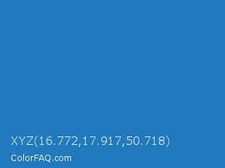XYZ 16.772,17.917,50.718 Color is a normal blue color and the nearest color is Cyan Cornflower Blue #188bc2. Hex code #217abd and RGB value is rgb(33,122,189). In RGB color space, this color is composed of 13% red, 48% green, 74% blue, In CMYK color space, this color is composed of 83% cyan, 35% magenta, 0% yellow , 26% black , In HSL color space, this color has a hue angle of 206° , 70% saturation and 44% lightness.