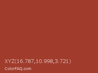XYZ 16.787,10.998,3.721 Color is a normal red color and the nearest color is Sweet Brown #a83731. Hex code #a13c2d and RGB value is rgb(161,60,45). In RGB color space, this color is composed of 63% red, 24% green, 18% blue, In CMYK color space, this color is composed of 0% cyan, 63% magenta, 72% yellow , 37% black , In HSL color space, this color has a hue angle of 8° , 56% saturation and 40% lightness.