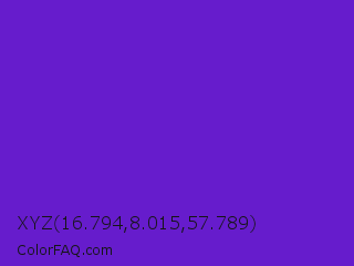 XYZ 16.794,8.015,57.789 Color is a normal violet color and the nearest color is Purple Heart Crayola #652dc1. Hex code #661ccc and RGB value is rgb(102,28,204). In RGB color space, this color is composed of 40% red, 11% green, 80% blue, In CMYK color space, this color is composed of 50% cyan, 86% magenta, 0% yellow , 20% black , In HSL color space, this color has a hue angle of 265° , 76% saturation and 45% lightness.