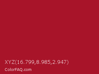 XYZ 16.799,8.985,2.947 Color is a normal red color and the nearest color is Upsdell Red #ae2029. Hex code #a81429 and RGB value is rgb(168,20,41). In RGB color space, this color is composed of 66% red, 8% green, 16% blue, In CMYK color space, this color is composed of 0% cyan, 88% magenta, 76% yellow , 34% black , In HSL color space, this color has a hue angle of 351° , 79% saturation and 37% lightness.