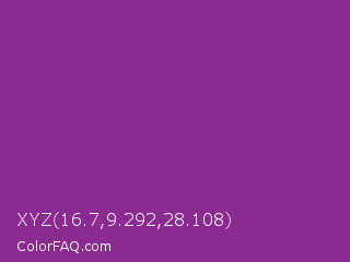 XYZ 16.7,9.292,28.108 Color is a normal magenta color and the nearest color is Vivid Violet #803790. Hex code #8b2b92 and RGB value is rgb(139,43,146). In RGB color space, this color is composed of 55% red, 17% green, 57% blue, In CMYK color space, this color is composed of 5% cyan, 71% magenta, 0% yellow , 43% black , In HSL color space, this color has a hue angle of 296° , 54% saturation and 37% lightness.
