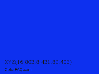 XYZ 16.803,8.431,82.403 Color is a normal blue color and the nearest color is Bluebonnet #1c1cf0. Hex code #0d30ef and RGB value is rgb(13,48,239). In RGB color space, this color is composed of 5% red, 19% green, 94% blue, In CMYK color space, this color is composed of 95% cyan, 80% magenta, 0% yellow , 6% black , In HSL color space, this color has a hue angle of 231° , 90% saturation and 49% lightness.