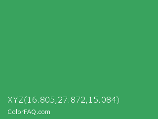 XYZ 16.805,27.872,15.084 Color is a normal green color and the nearest color is Chateau Green #40a860. Hex code #39a35e and RGB value is rgb(57,163,94). In RGB color space, this color is composed of 22% red, 64% green, 37% blue, In CMYK color space, this color is composed of 65% cyan, 0% magenta, 42% yellow , 36% black , In HSL color space, this color has a hue angle of 141° , 48% saturation and 43% lightness.