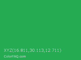 XYZ 16.811,30.113,12.711 Color is a normal green color and the nearest color is Chateau Green #40a860. Hex code #25ab51 and RGB value is rgb(37,171,81). In RGB color space, this color is composed of 15% red, 67% green, 32% blue, In CMYK color space, this color is composed of 78% cyan, 0% magenta, 53% yellow , 33% black , In HSL color space, this color has a hue angle of 140° , 64% saturation and 41% lightness.