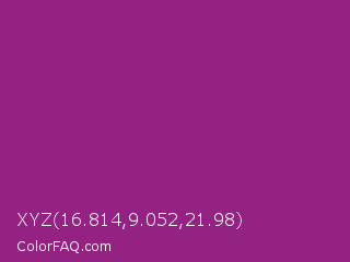 XYZ 16.814,9.052,21.98 Color is a normal magenta color and the nearest color is Razzmic Berry Crayola #843179. Hex code #942282 and RGB value is rgb(148,34,130). In RGB color space, this color is composed of 58% red, 13% green, 51% blue, In CMYK color space, this color is composed of 0% cyan, 77% magenta, 12% yellow , 42% black , In HSL color space, this color has a hue angle of 309° , 63% saturation and 36% lightness.