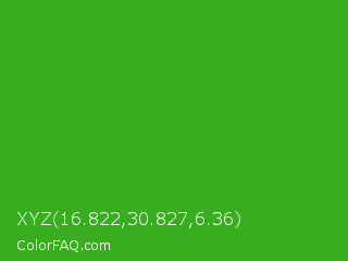 XYZ 16.822,30.827,6.36 Color is a normal green color and the nearest color is Wageningen Green #34b233. Hex code #38ad1f and RGB value is rgb(56,173,31). In RGB color space, this color is composed of 22% red, 68% green, 12% blue, In CMYK color space, this color is composed of 68% cyan, 0% magenta, 82% yellow , 32% black , In HSL color space, this color has a hue angle of 109° , 70% saturation and 40% lightness.