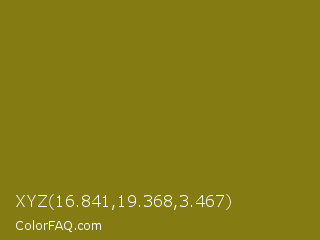 XYZ 16.841,19.368,3.467 Color is a dark yellow color and the nearest color is Trendy Green #7c881a. Hex code #847c13 and RGB value is rgb(132,124,19). In RGB color space, this color is composed of 52% red, 49% green, 7% blue, In CMYK color space, this color is composed of 0% cyan, 6% magenta, 86% yellow , 48% black , In HSL color space, this color has a hue angle of 56° , 75% saturation and 30% lightness.