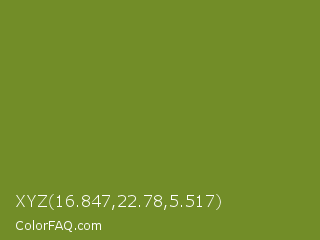 XYZ 16.847,22.78,5.517 Color is a normal lime color and the nearest color is Wasabi #788a25. Hex code #728d28 and RGB value is rgb(114,141,40). In RGB color space, this color is composed of 45% red, 55% green, 16% blue, In CMYK color space, this color is composed of 19% cyan, 0% magenta, 72% yellow , 45% black , In HSL color space, this color has a hue angle of 76° , 56% saturation and 35% lightness.