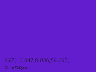 XYZ 16.847,8.036,59.695 Color is a normal violet color and the nearest color is Purple Heart Crayola #652dc1. Hex code #631dcf and RGB value is rgb(99,29,207). In RGB color space, this color is composed of 39% red, 11% green, 81% blue, In CMYK color space, this color is composed of 52% cyan, 86% magenta, 0% yellow , 19% black , In HSL color space, this color has a hue angle of 264° , 75% saturation and 46% lightness.
