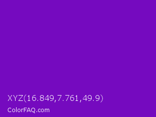 XYZ 16.849,7.761,49.9 Color is a normal purple color and the nearest color is French Violet #8806ce. Hex code #750abf and RGB value is rgb(117,10,191). In RGB color space, this color is composed of 46% red, 4% green, 75% blue, In CMYK color space, this color is composed of 39% cyan, 95% magenta, 0% yellow , 25% black , In HSL color space, this color has a hue angle of 275° , 90% saturation and 39% lightness.