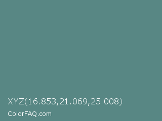 XYZ 16.853,21.069,25.008 Color is a normal cyan color and the nearest color is Wintergreen Dream #56887d. Hex code #588784 and RGB value is rgb(88,135,132). In RGB color space, this color is composed of 35% red, 53% green, 52% blue, In CMYK color space, this color is composed of 35% cyan, 0% magenta, 2% yellow , 47% black , In HSL color space, this color has a hue angle of 176° , 21% saturation and 44% lightness.