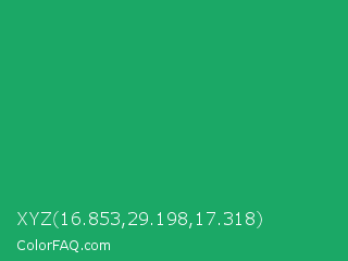 XYZ 16.853,29.198,17.318 Color is a normal green color and the nearest color is Green Crayola #1cac78. Hex code #1ba866 and RGB value is rgb(27,168,102). In RGB color space, this color is composed of 11% red, 66% green, 40% blue, In CMYK color space, this color is composed of 84% cyan, 0% magenta, 39% yellow , 34% black , In HSL color space, this color has a hue angle of 152° , 72% saturation and 38% lightness.