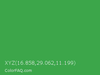 XYZ 16.858,29.062,11.199 Color is a normal green color and the nearest color is Chateau Green #40a860. Hex code #3ba74a and RGB value is rgb(59,167,74). In RGB color space, this color is composed of 23% red, 65% green, 29% blue, In CMYK color space, this color is composed of 65% cyan, 0% magenta, 56% yellow , 35% black , In HSL color space, this color has a hue angle of 128° , 48% saturation and 44% lightness.