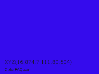 XYZ 16.874,7.111,80.604 Color is a normal indigo color and the nearest color is Electric Ultramarine #3f00ff. Hex code #350bed and RGB value is rgb(53,11,237). In RGB color space, this color is composed of 21% red, 4% green, 93% blue, In CMYK color space, this color is composed of 78% cyan, 95% magenta, 0% yellow , 7% black , In HSL color space, this color has a hue angle of 251° , 91% saturation and 49% lightness.