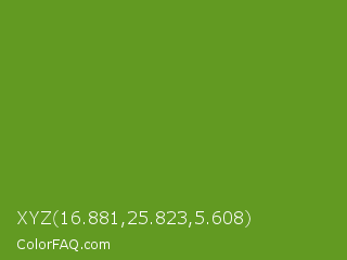 XYZ 16.881,25.823,5.608 Color is a normal green color and the nearest color is Olive Drab #6b8e23. Hex code #629a22 and RGB value is rgb(98,154,34). In RGB color space, this color is composed of 38% red, 60% green, 13% blue, In CMYK color space, this color is composed of 36% cyan, 0% magenta, 78% yellow , 40% black , In HSL color space, this color has a hue angle of 88° , 64% saturation and 37% lightness.