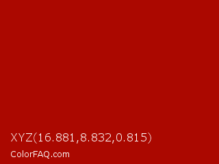 XYZ 16.881,8.832,0.815 Color is a normal red color and the nearest color is Mordant Red 19 #ae0c00. Hex code #ab0800 and RGB value is rgb(171,8,0). In RGB color space, this color is composed of 67% red, 3% green, 0% blue, In CMYK color space, this color is composed of 0% cyan, 95% magenta, 100% yellow , 33% black , In HSL color space, this color has a hue angle of 3° , 100% saturation and 34% lightness.