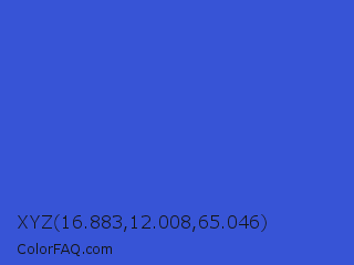 XYZ 16.883,12.008,65.046 Color is a normal blue color and the nearest color is Royal Blue #4169e1. Hex code #3754d6 and RGB value is rgb(55,84,214). In RGB color space, this color is composed of 22% red, 33% green, 84% blue, In CMYK color space, this color is composed of 74% cyan, 61% magenta, 0% yellow , 16% black , In HSL color space, this color has a hue angle of 229° , 66% saturation and 53% lightness.
