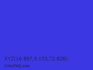 XYZ 16.897,9.153,72.828 Color is a normal indigo color and the nearest color is Palatinate Blue #273be2. Hex code #3b37e2 and RGB value is rgb(59,55,226). In RGB color space, this color is composed of 23% red, 22% green, 89% blue, In CMYK color space, this color is composed of 74% cyan, 76% magenta, 0% yellow , 11% black , In HSL color space, this color has a hue angle of 241° , 75% saturation and 55% lightness.