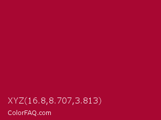 XYZ 16.8,8.707,3.813 Color is a normal rose color and the nearest color is Shiraz #b20931. Hex code #a80732 and RGB value is rgb(168,7,50). In RGB color space, this color is composed of 66% red, 3% green, 20% blue, In CMYK color space, this color is composed of 0% cyan, 96% magenta, 70% yellow , 34% black , In HSL color space, this color has a hue angle of 344° , 92% saturation and 34% lightness.