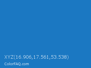 XYZ 16.906,17.561,53.538 Color is a normal blue color and the nearest color is Bright Navy Blue #1974d2. Hex code #1b78c2 and RGB value is rgb(27,120,194). In RGB color space, this color is composed of 11% red, 47% green, 76% blue, In CMYK color space, this color is composed of 86% cyan, 38% magenta, 0% yellow , 24% black , In HSL color space, this color has a hue angle of 207° , 76% saturation and 43% lightness.
