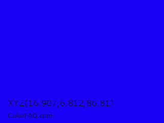 XYZ 16.907,6.812,86.81 Color is a normal indigo color and the nearest color is Blue #0000ff. Hex code #1a00f5 and RGB value is rgb(26,0,245). In RGB color space, this color is composed of 10% red, 0% green, 96% blue, In CMYK color space, this color is composed of 89% cyan, 100% magenta, 0% yellow , 4% black , In HSL color space, this color has a hue angle of 246° , 100% saturation and 48% lightness.
