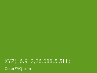 XYZ 16.912,26.088,5.511 Color is a normal green color and the nearest color is Olive Drab #6b8e23. Hex code #619b20 and RGB value is rgb(97,155,32). In RGB color space, this color is composed of 38% red, 61% green, 13% blue, In CMYK color space, this color is composed of 37% cyan, 0% magenta, 79% yellow , 39% black , In HSL color space, this color has a hue angle of 88° , 66% saturation and 37% lightness.