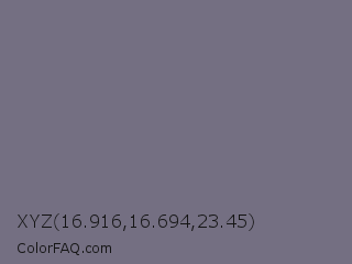XYZ 16.916,16.694,23.45 Color is a normal indigo color and the nearest color is Storm Gray #717486. Hex code #746f82 and RGB value is rgb(116,111,130). In RGB color space, this color is composed of 45% red, 44% green, 51% blue, In CMYK color space, this color is composed of 11% cyan, 15% magenta, 0% yellow , 49% black , In HSL color space, this color has a hue angle of 256° , 8% saturation and 47% lightness.