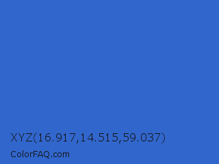 XYZ 16.917,14.515,59.037 Color is a normal blue color and the nearest color is Mariner #286acd. Hex code #3166cc and RGB value is rgb(49,102,204). In RGB color space, this color is composed of 19% red, 40% green, 80% blue, In CMYK color space, this color is composed of 76% cyan, 50% magenta, 0% yellow , 20% black , In HSL color space, this color has a hue angle of 219° , 61% saturation and 50% lightness.