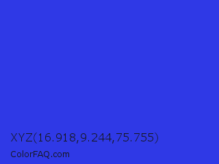 XYZ 16.918,9.244,75.755 Color is a normal blue color and the nearest color is Palatinate Blue #273be2. Hex code #2f39e6 and RGB value is rgb(47,57,230). In RGB color space, this color is composed of 18% red, 22% green, 90% blue, In CMYK color space, this color is composed of 80% cyan, 75% magenta, 0% yellow , 10% black , In HSL color space, this color has a hue angle of 237° , 79% saturation and 54% lightness.