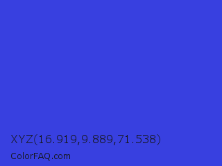 XYZ 16.919,9.889,71.538 Color is a normal blue color and the nearest color is Palatinate Blue #273be2. Hex code #3840e0 and RGB value is rgb(56,64,224). In RGB color space, this color is composed of 22% red, 25% green, 88% blue, In CMYK color space, this color is composed of 75% cyan, 71% magenta, 0% yellow , 12% black , In HSL color space, this color has a hue angle of 237° , 73% saturation and 55% lightness.