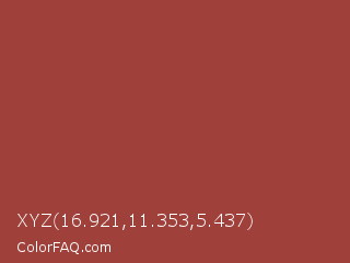XYZ 16.921,11.353,5.437 Color is a normal red color and the nearest color is Chestnut #954535. Hex code #9f403b and RGB value is rgb(159,64,59). In RGB color space, this color is composed of 62% red, 25% green, 23% blue, In CMYK color space, this color is composed of 0% cyan, 60% magenta, 63% yellow , 38% black , In HSL color space, this color has a hue angle of 3° , 46% saturation and 43% lightness.
