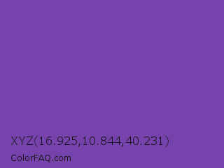 XYZ 16.925,10.844,40.231 Color is a normal violet color and the nearest color is Studio #714ab2. Hex code #7643ac and RGB value is rgb(118,67,172). In RGB color space, this color is composed of 46% red, 26% green, 67% blue, In CMYK color space, this color is composed of 31% cyan, 61% magenta, 0% yellow , 33% black , In HSL color space, this color has a hue angle of 269° , 44% saturation and 47% lightness.