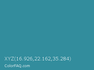 XYZ 16.926,22.162,35.284 Color is a normal cyan color and the nearest color is Astral #327da0. Hex code #328d9d and RGB value is rgb(50,141,157). In RGB color space, this color is composed of 20% red, 55% green, 62% blue, In CMYK color space, this color is composed of 68% cyan, 10% magenta, 0% yellow , 38% black , In HSL color space, this color has a hue angle of 189° , 52% saturation and 41% lightness.
