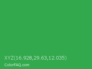 XYZ 16.928,29.63,12.035 Color is a normal green color and the nearest color is Chateau Green #40a860. Hex code #33a94e and RGB value is rgb(51,169,78). In RGB color space, this color is composed of 20% red, 66% green, 31% blue, In CMYK color space, this color is composed of 70% cyan, 0% magenta, 54% yellow , 34% black , In HSL color space, this color has a hue angle of 134° , 54% saturation and 43% lightness.
