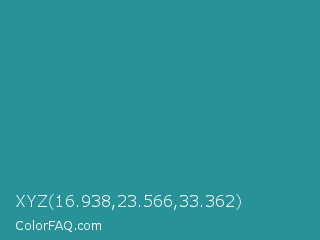 XYZ 16.938,23.566,33.362 Color is a normal cyan color and the nearest color is Lochinvar #2c8c84. Hex code #279398 and RGB value is rgb(39,147,152). In RGB color space, this color is composed of 15% red, 58% green, 60% blue, In CMYK color space, this color is composed of 74% cyan, 3% magenta, 0% yellow , 40% black , In HSL color space, this color has a hue angle of 183° , 59% saturation and 37% lightness.