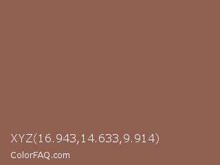 XYZ 16.943,14.633,9.914 Color is a normal red color and the nearest color is Spicy Mix #8b5f4d. Hex code #8f5f52 and RGB value is rgb(143,95,82). In RGB color space, this color is composed of 56% red, 37% green, 32% blue, In CMYK color space, this color is composed of 0% cyan, 34% magenta, 43% yellow , 44% black , In HSL color space, this color has a hue angle of 13° , 27% saturation and 44% lightness.