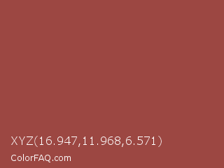 XYZ 16.947,11.968,6.571 Color is a normal red color and the nearest color is Copper Rust #944747. Hex code #9c4742 and RGB value is rgb(156,71,66). In RGB color space, this color is composed of 61% red, 28% green, 26% blue, In CMYK color space, this color is composed of 0% cyan, 54% magenta, 58% yellow , 39% black , In HSL color space, this color has a hue angle of 3° , 41% saturation and 44% lightness.