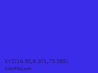 XYZ 16.95,8.371,75.585 Color is a normal indigo color and the nearest color is Palatinate Blue #273be2. Hex code #3b2be6 and RGB value is rgb(59,43,230). In RGB color space, this color is composed of 23% red, 17% green, 90% blue, In CMYK color space, this color is composed of 74% cyan, 81% magenta, 0% yellow , 10% black , In HSL color space, this color has a hue angle of 245° , 79% saturation and 54% lightness.