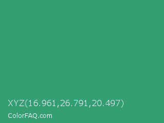 XYZ 16.961,26.791,20.497 Color is a normal green color and the nearest color is Illuminating Emerald #319177. Hex code #359f73 and RGB value is rgb(53,159,115). In RGB color space, this color is composed of 21% red, 62% green, 45% blue, In CMYK color space, this color is composed of 67% cyan, 0% magenta, 28% yellow , 38% black , In HSL color space, this color has a hue angle of 155° , 50% saturation and 42% lightness.