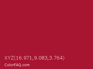 XYZ 16.971,9.083,3.764 Color is a normal red color and the nearest color is Vivid Burgundy #9f1d35. Hex code #a81531 and RGB value is rgb(168,21,49). In RGB color space, this color is composed of 66% red, 8% green, 19% blue, In CMYK color space, this color is composed of 0% cyan, 88% magenta, 71% yellow , 34% black , In HSL color space, this color has a hue angle of 349° , 78% saturation and 37% lightness.