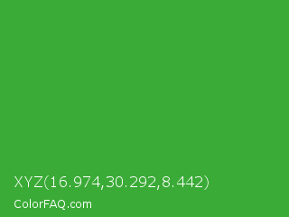 XYZ 16.974,30.292,8.442 Color is a normal green color and the nearest color is Wageningen Green #34b233. Hex code #3aab36 and RGB value is rgb(58,171,54). In RGB color space, this color is composed of 23% red, 67% green, 21% blue, In CMYK color space, this color is composed of 66% cyan, 0% magenta, 68% yellow , 33% black , In HSL color space, this color has a hue angle of 118° , 52% saturation and 44% lightness.