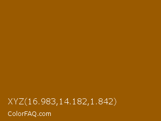 XYZ 16.983,14.182,1.842 Color is a dark orange color and the nearest color is Chelsea Gem #9e5302. Hex code #9a5a00 and RGB value is rgb(154,90,0). In RGB color space, this color is composed of 60% red, 35% green, 0% blue, In CMYK color space, this color is composed of 0% cyan, 42% magenta, 100% yellow , 40% black , In HSL color space, this color has a hue angle of 35° , 100% saturation and 30% lightness.