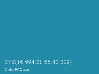 XYZ 16.994,21.65,40.329 Color is a normal cyan color and the nearest color is Eastern Blue #1e9ab0. Hex code #238ba8 and RGB value is rgb(35,139,168). In RGB color space, this color is composed of 14% red, 55% green, 66% blue, In CMYK color space, this color is composed of 79% cyan, 17% magenta, 0% yellow , 34% black , In HSL color space, this color has a hue angle of 193° , 66% saturation and 40% lightness.