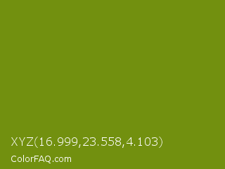 XYZ 16.999,23.558,4.103 Color is a normal lime color and the nearest color is Trendy Green #7c881a. Hex code #72900f and RGB value is rgb(114,144,15). In RGB color space, this color is composed of 45% red, 56% green, 6% blue, In CMYK color space, this color is composed of 21% cyan, 0% magenta, 90% yellow , 44% black , In HSL color space, this color has a hue angle of 74° , 81% saturation and 31% lightness.
