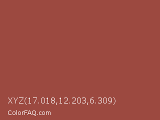 XYZ 17.018,12.203,6.309 Color is a normal red color and the nearest color is Copper Rust #944747. Hex code #9c4940 and RGB value is rgb(156,73,64). In RGB color space, this color is composed of 61% red, 29% green, 25% blue, In CMYK color space, this color is composed of 0% cyan, 53% magenta, 59% yellow , 39% black , In HSL color space, this color has a hue angle of 6° , 42% saturation and 43% lightness.