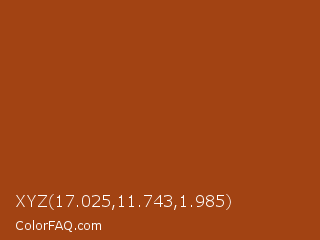 XYZ 17.025,11.743,1.985 Color is a normal orange color and the nearest color is Cognac #9f381d. Hex code #a24313 and RGB value is rgb(162,67,19). In RGB color space, this color is composed of 64% red, 26% green, 7% blue, In CMYK color space, this color is composed of 0% cyan, 59% magenta, 88% yellow , 36% black , In HSL color space, this color has a hue angle of 20° , 79% saturation and 35% lightness.