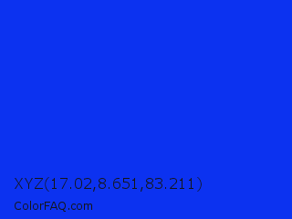 XYZ 17.02,8.651,83.211 Color is a normal blue color and the nearest color is Blue RYB #0247fe. Hex code #0c32f0 and RGB value is rgb(12,50,240). In RGB color space, this color is composed of 5% red, 20% green, 94% blue, In CMYK color space, this color is composed of 95% cyan, 79% magenta, 0% yellow , 6% black , In HSL color space, this color has a hue angle of 230° , 90% saturation and 49% lightness.