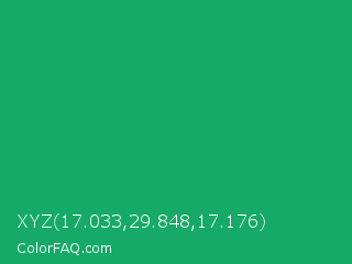 XYZ 17.033,29.848,17.176 Color is a normal green color and the nearest color is Green Crayola #1cac78. Hex code #15aa65 and RGB value is rgb(21,170,101). In RGB color space, this color is composed of 8% red, 67% green, 40% blue, In CMYK color space, this color is composed of 88% cyan, 0% magenta, 41% yellow , 33% black , In HSL color space, this color has a hue angle of 152° , 78% saturation and 37% lightness.