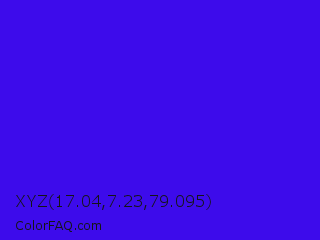 XYZ 17.04,7.23,79.095 Color is a normal indigo color and the nearest color is Electric Ultramarine #3f00ff. Hex code #3d0beb and RGB value is rgb(61,11,235). In RGB color space, this color is composed of 24% red, 4% green, 92% blue, In CMYK color space, this color is composed of 74% cyan, 95% magenta, 0% yellow , 8% black , In HSL color space, this color has a hue angle of 253° , 91% saturation and 48% lightness.